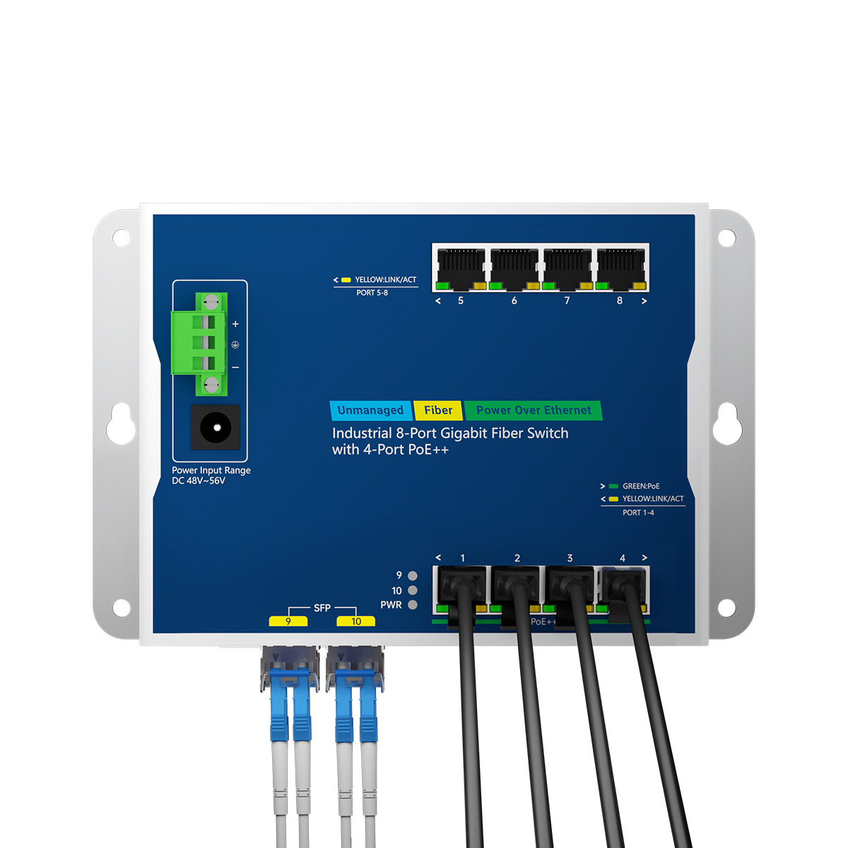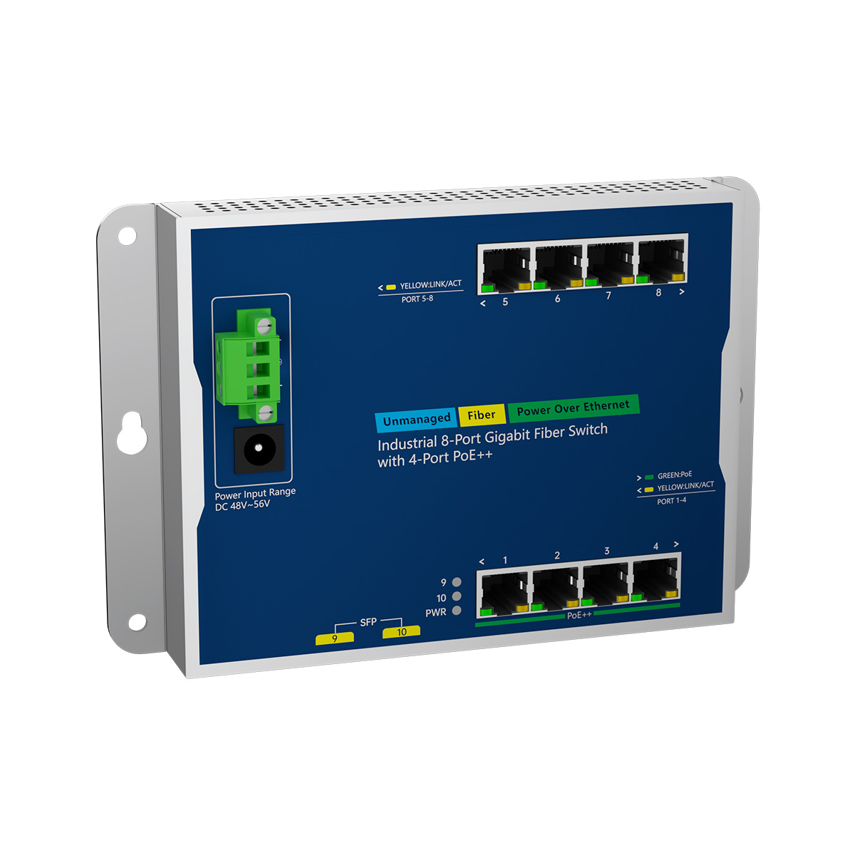 IES7211W-4P4GE2GF-DC, Flat-type 8 Port Gigabit Industrial Fiber Switch with 4 PoE++, 2 Gigabit SFP Uplink, Wall-mount or DIN-Rail Mount